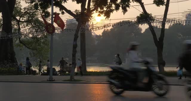 HANOI, VIETNAM - OCTOBER 27, 2015: City highway on waterside with lots of motorbikes and few cars at sunset. Hanoi is traffic packed city with domination of motorcycles