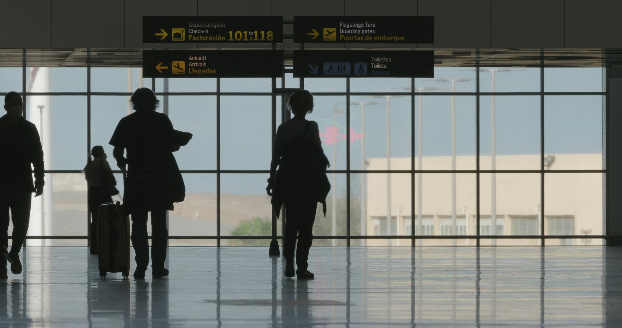 Defocused shot of airport terminal and people walking with luggage and carts