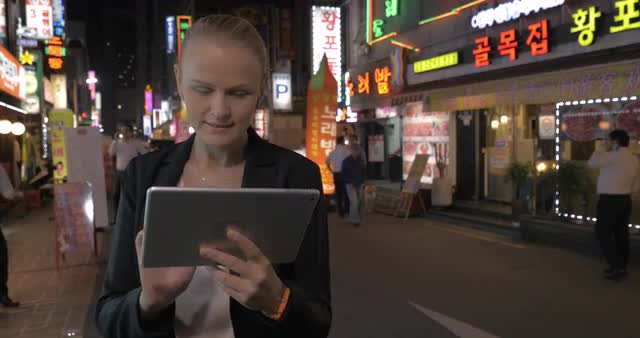 Smiling young woman typing on digital tablet in night city and then walking along the street with lots of colorful illuminated banners. Seoul, South Korea