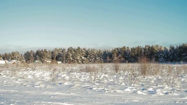 the Camera Slowly Descends From the Sky on the Snowy Valley. in the Background Coniferous Forest.