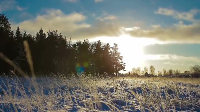 Snowy Field Illuminated by the Sun Peeking From Behind the Forest Edge. Frozen Spikes Swaying in the Wind.