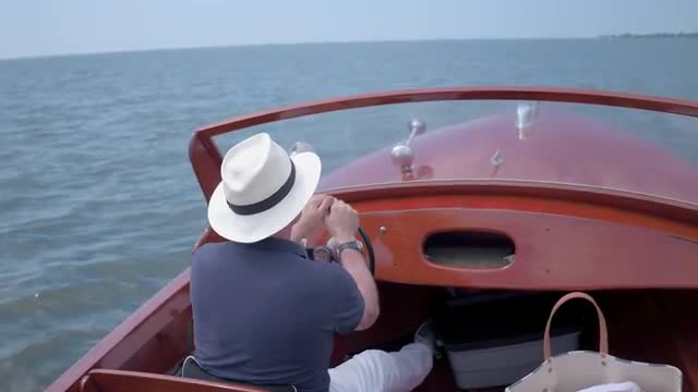 > Man driving a beautiful retro boat