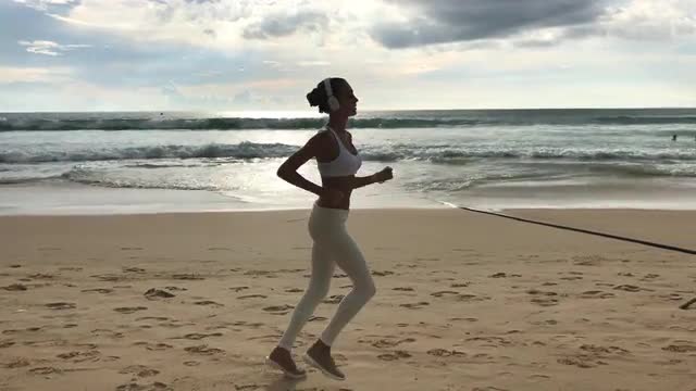 Portrait of sport fitness girl jogging exercising outside on beach