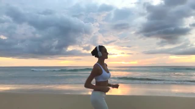 123236 - Slow motion shot of woman running on beach in morning