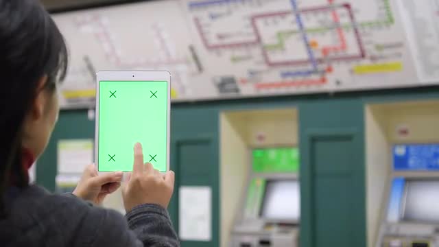 > Green Screen - Japanese woman using tablet downtown Tokyo, Japan