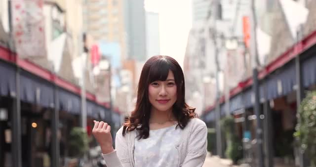Footage of young Japanese woman standing in traditional shopping street downtown Tokyo, Japan