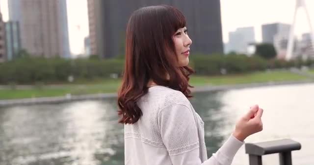 > Young Japanese woman walking by a river downtown Tokyo, Japan