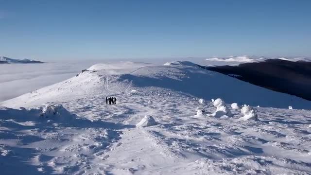 Travellers With Backpacks Make a Winter Hike Above the Clouds With a View of the Distant Peaks by a