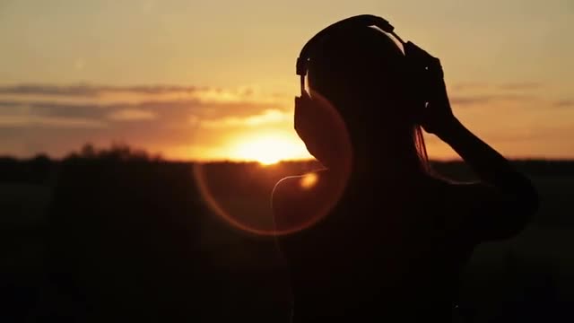 Woman listening to music in headphones and dancing in the forest after sunset. Freedom and happiness concept