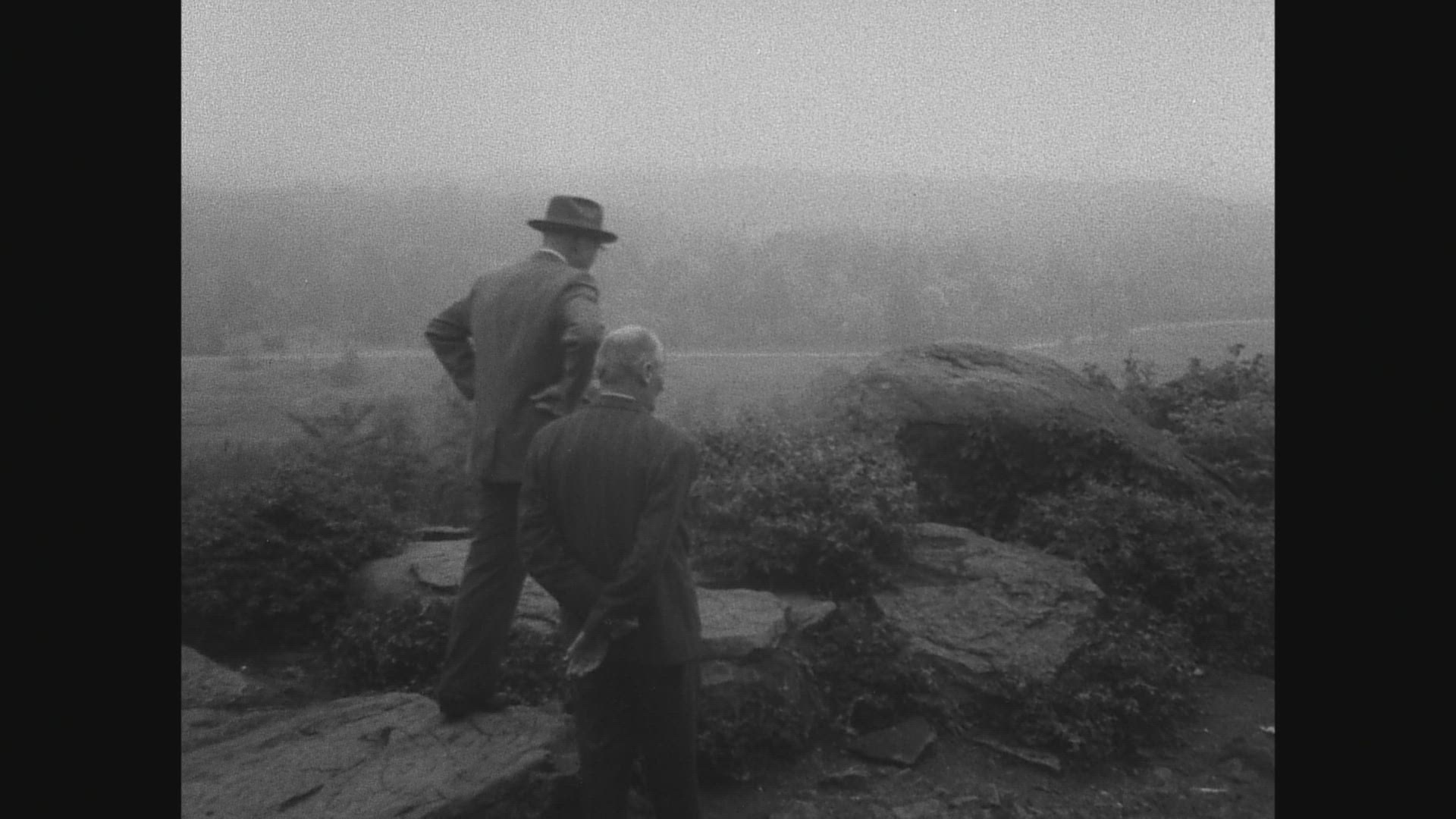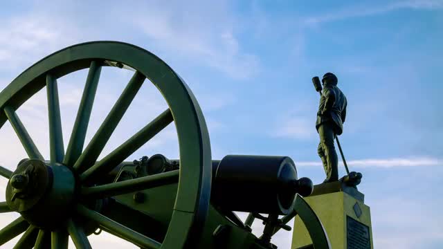 Time-lapse of the sun setting beyond the spokes of a canon wheel above the Devil's Den in Gettysburg National Military Park.