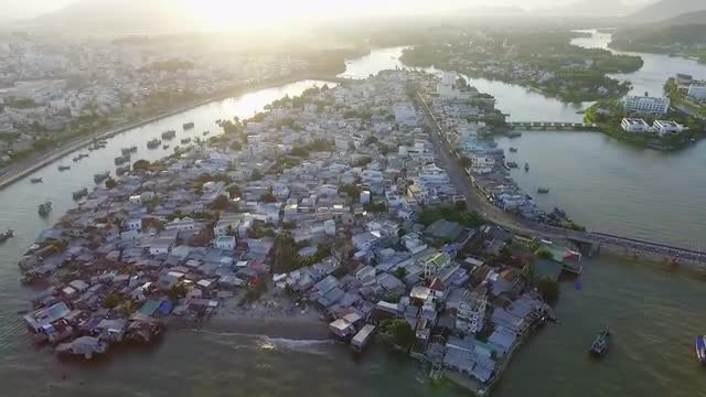 Aerial View of the River and the Island With Wooden Houses and Slums at Sunset, Asia, Vietnam