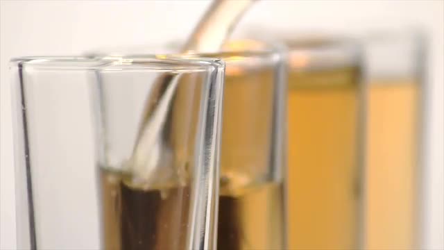 Four double shot glasses are lined up, each one set apart farther off in the background, as alcohol is poured into each glass, one by one.