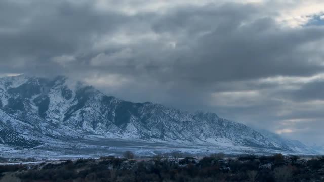 Fast moving clouds against a snow covered Wyoming mountainside.