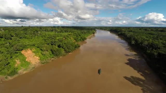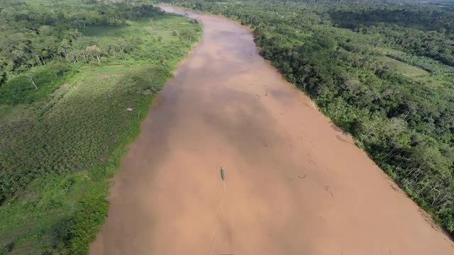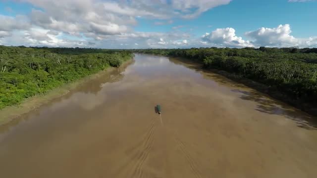 690257 - Aerial of boat moving along Amazon River
