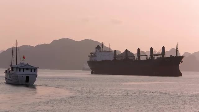 > WS Large ship in bay at sunset / Ha Long Bay, Vietnam