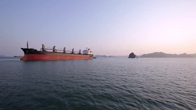 WS Container ship at dusk in bay / Ha Long Bay, Vietnam
