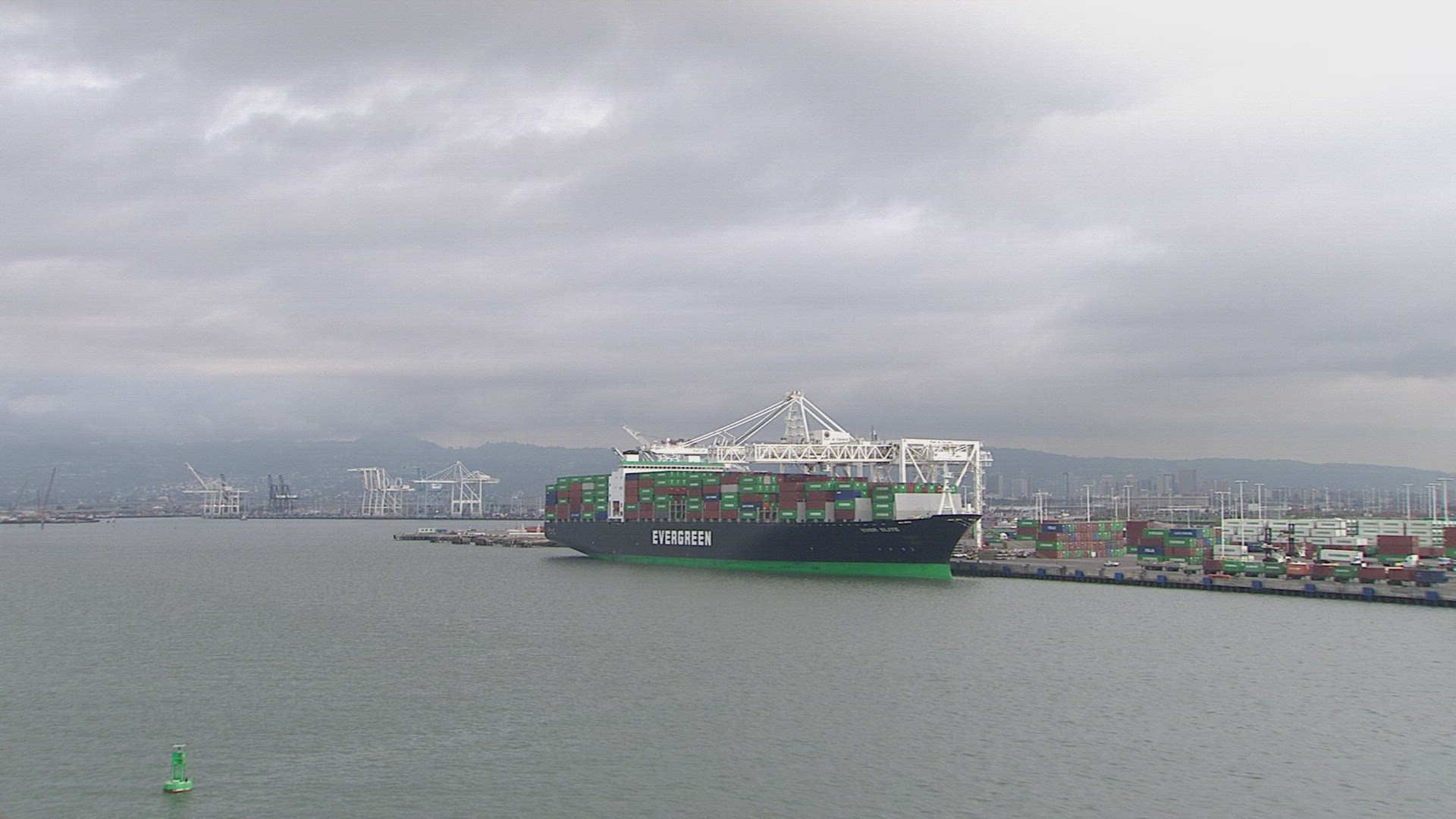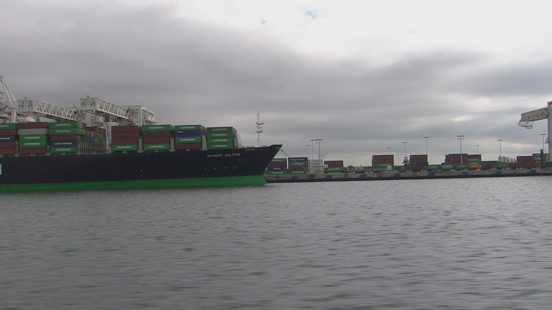 > WS Container ship at dusk in bay / Ha Long Bay, Vietnam