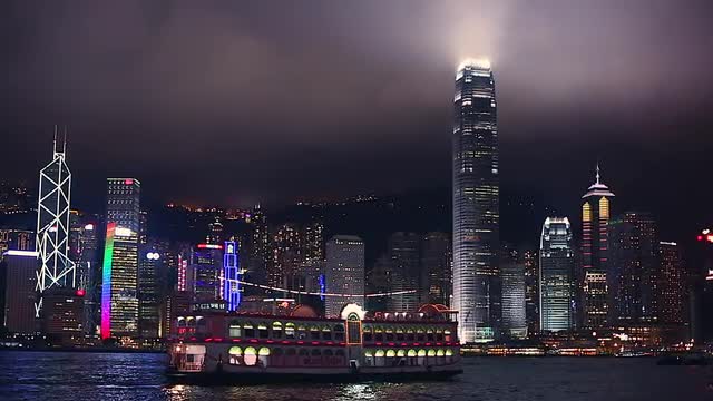 WS Harbor ferries at night / Hong Kong, China