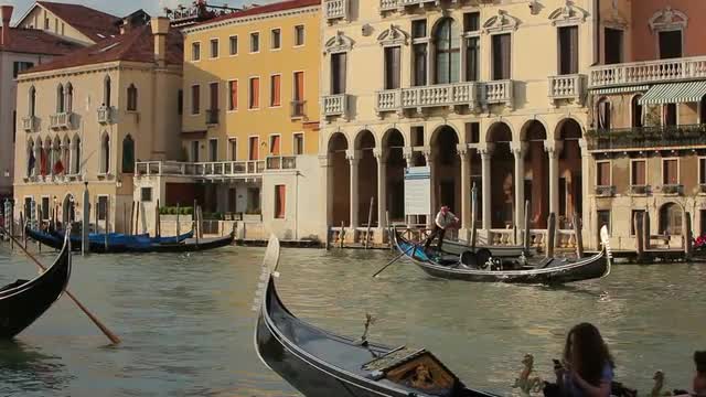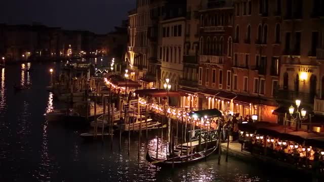 > WS LD Night View of Boats Floating down Grand Canal / Venice, Italy
