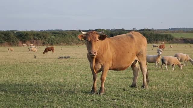 WS Cows and Sheep Grazing in Countryside / Cornwall, England, UK