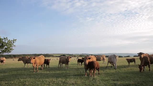 > WS Herd of Cows Grazing in Field / Cornwall, England, UK