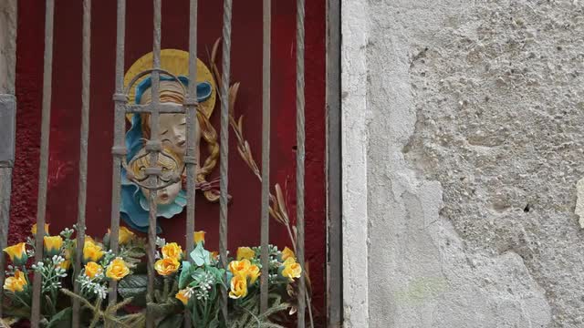 CU TU Flowers in Shrine of Virgin Mary and Baby Jesus / Venice, Italy