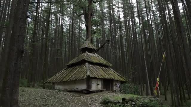 > WS TD Old hindu temple surrounded by trees in Himalayan mountains / India