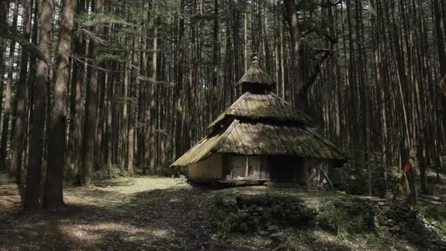 > WS Old hindu temple surrounded by trees in Himalayan mountains / India