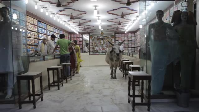 692115 - WS Cow standing in sari shop / Varanasi, India