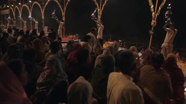 > WS Men carrying out oil lamps for Aarti Puja ceremony / Varanasi, India