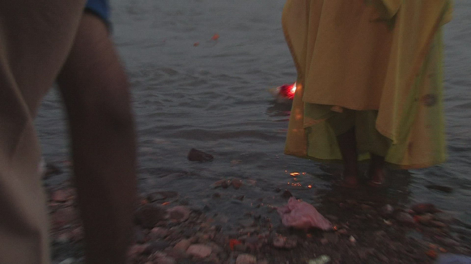 MS R/F Illuminated offerings floating down river Ganges at night / Varanasi, India
