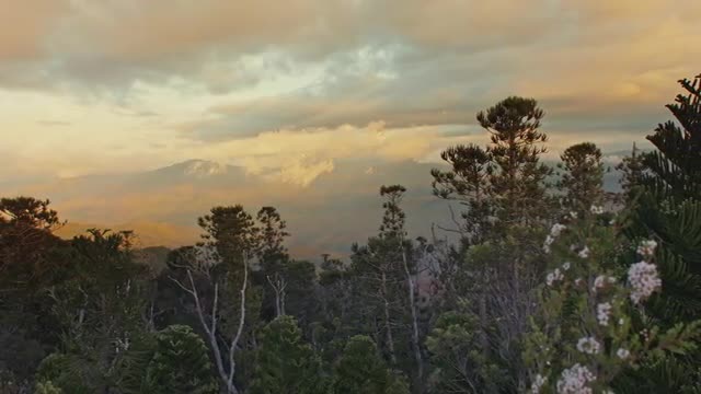 Tilt shot of Sunset at top of a mountain, araucarias tree in the foreground