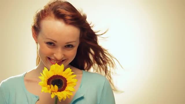 693186 - CU Woman with Red Hair Holding Sunflower and Smiling