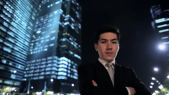 > MH LA PAN Young Businessman Standing in front of Buildings at Night / Singapore