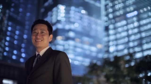 MH LA TD Businessman Standing on Street at Night, Buildings in Background / Singapore