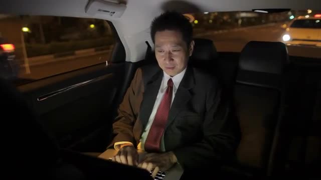 > MH LD Businessman Working on Laptop at Night, Illuminated Buildings in Background / Singapore