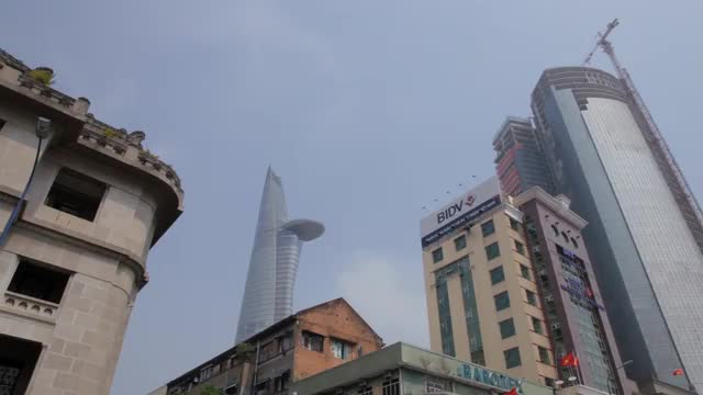 > WS LA LD Vietnamese Flag Waving from Helipad of Bitexco Financial Tower / Ho Chi Minh, Vietnam