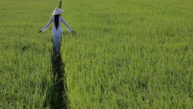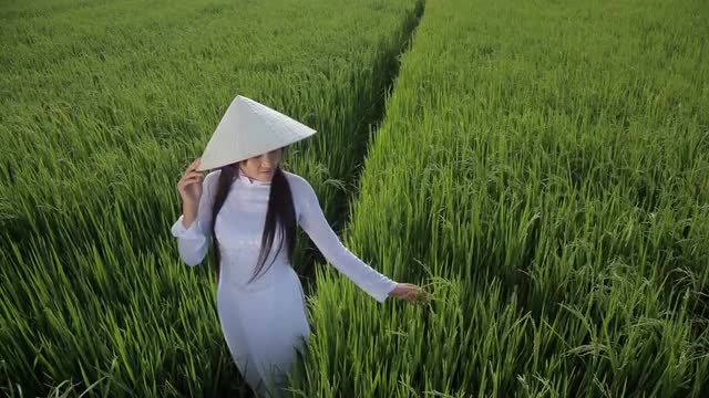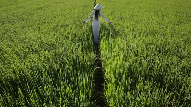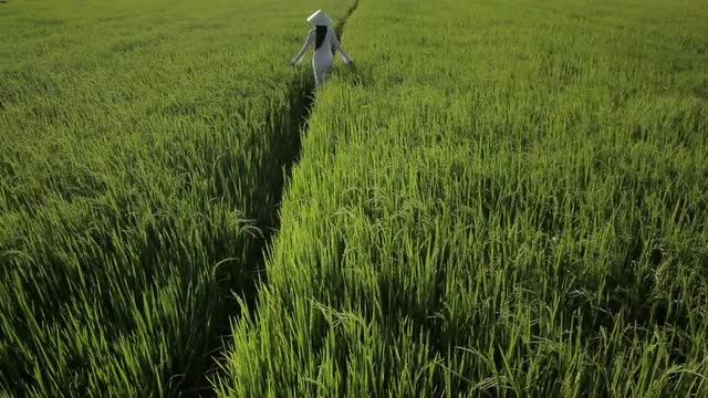 693628 - WS HA LD Young Woman Wearing Ao Dai Walking Across Rice Paddy / Vietnam