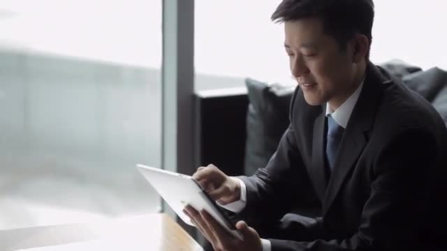 > MS Businessman using digital tablet in front of window / Beijing, China
