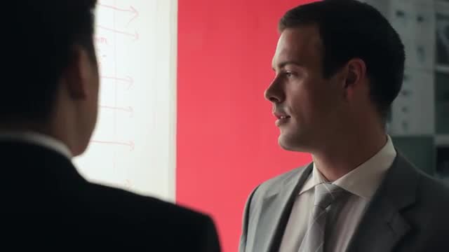 CU Two businessmen discussing and pointing on whiteboard / China