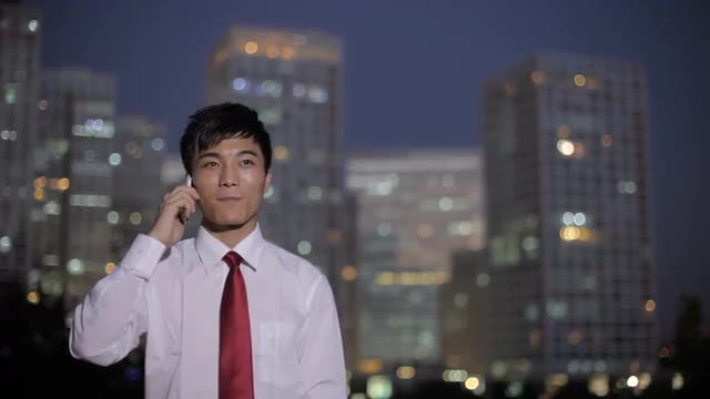> MS Businessman talking on mobile phone, cityscape in background at night / Beijing, China