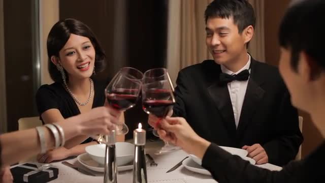 > MS Elegantly dressed couple talking during candle lit dinner / China