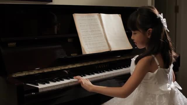 > MS Rear view of girl wearing white dress, playing piano then looking at camera / China