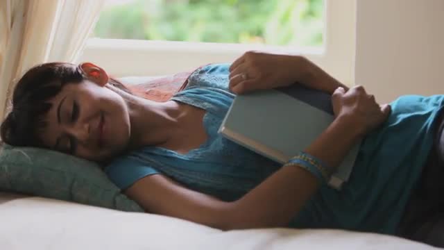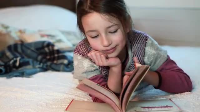 521931 - Young girl lying on bed reading book