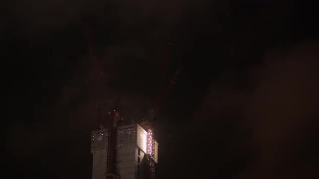 LA MS Construction on top of a building with tower cranes at night / Shanghai, China