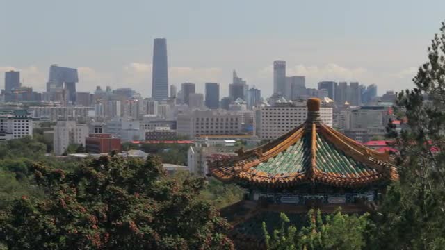 > WS PAN View of Beijing cityscape, with pagoda roof amongst trees in foreground / Beijing, China
