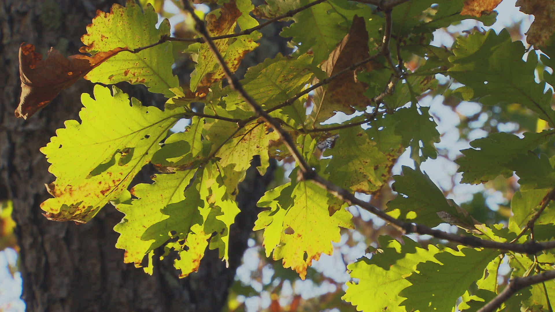 CU LA Tree leaves moving in wind by red wall / China
