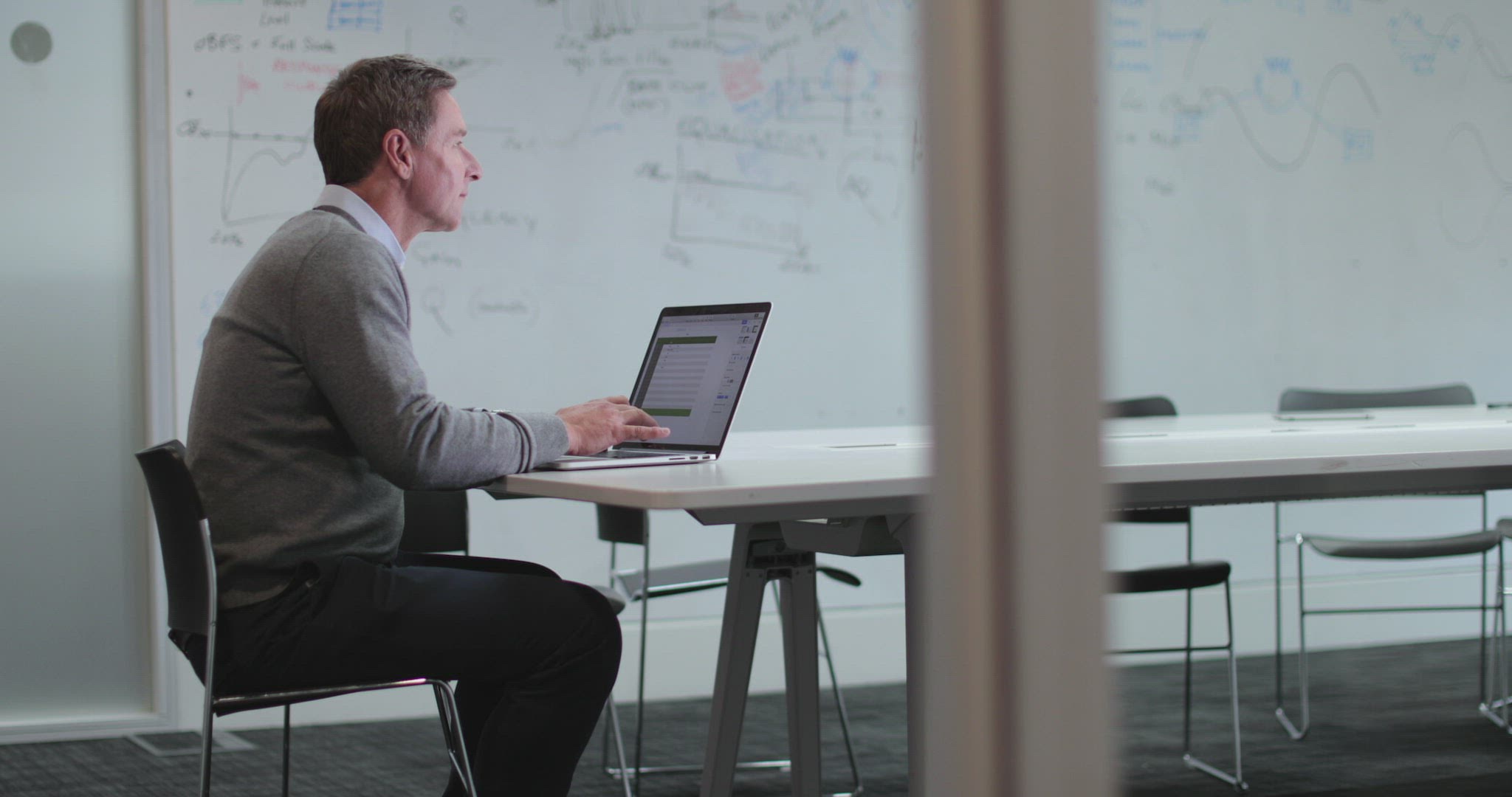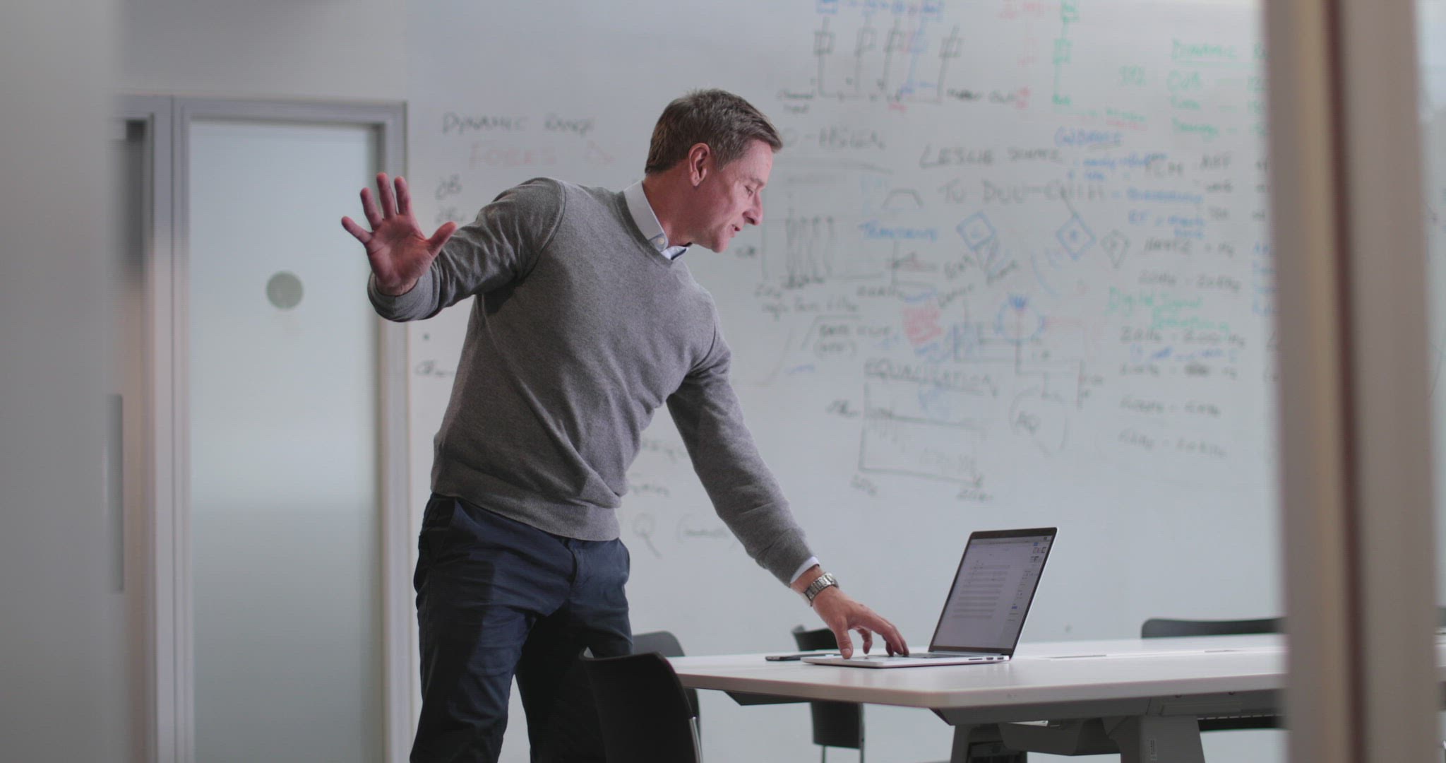 > CU R/F Businessman writing on glass wall and thinking