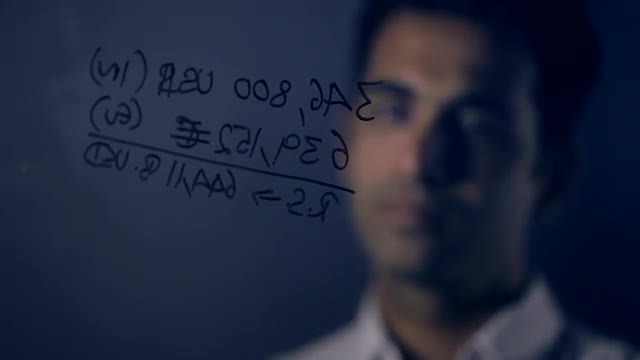 > CU R/F Businessman writing on glass wall and thinking