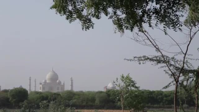 WS TU Cows grazing in field with Taj Mahal in background / Agra, India